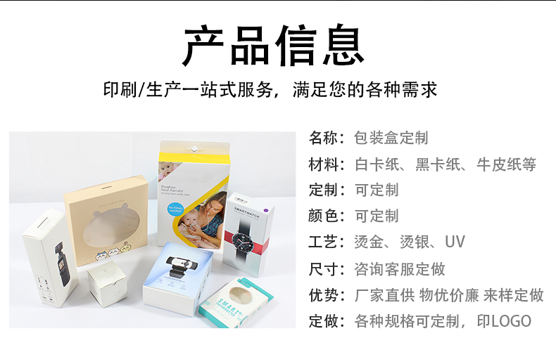 常用尺寸::?按需訂做 常用紙張::?單銅紙(白卡):250克、300克、350克、400克; 牛皮紙(白牛/黃牛):250克、300克、350克、400克; 白板紙(灰底白):250克、300克、350克、400克; 特種紙(常用120克裱于灰板紙上,品種繁多) 瓦楞紙(裱于單銅或白板面紙上,一般應(yīng)用于產(chǎn)品外包裝盒) 常用工藝::?啤、粘、過光/啞膠、UV、擊突、燙金/銀