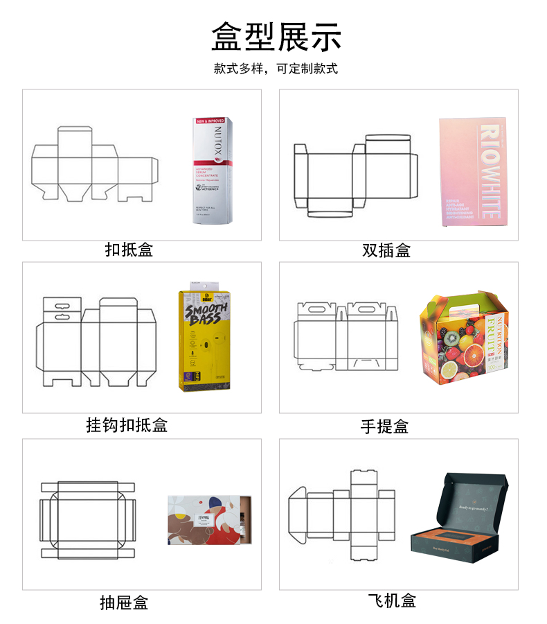 常用尺寸::?按需訂做 常用紙張::?單銅紙(白卡):250克、300克、350克、400克; 牛皮紙(白牛/黃牛):250克、300克、350克、400克; 白板紙(灰底白):250克、300克、350克、400克; 特種紙(常用120克裱于灰板紙上,品種繁多) 瓦楞紙(裱于單銅或白板面紙上,一般應(yīng)用于產(chǎn)品外包裝盒) 常用工藝::?啤、粘、過光/啞膠、UV、擊突、燙金/銀
