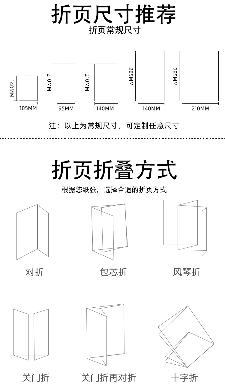 宣傳折頁(yè)印刷,宣傳物料印刷,折頁(yè)印刷 常用尺寸:?jiǎn)挝籱m:?210×285、420×285、285×630、285×840; 常用紙張:?雙銅紙、啞粉紙、雙膠紙、超感紙 (建議克數(shù):157克、200克、230克、250克) 常用工藝:?過(guò)光/啞膠、局部UV、壓紋、擊突、燙金/銀、印專(zhuān)金/專(zhuān)銀 出貨周期:?紙張200克以下厚度一般2~3天,紙張200克以上厚度壓線(xiàn)折頁(yè)一般3~4天(定稿起計(jì)) 包裝方式:?紙箱