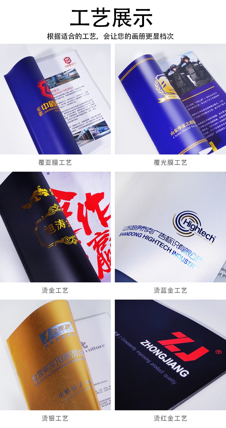 可選工藝:表面工藝可覆膜、過油、磨光、過膠、燙金/銀、壓紋、模切、UV、擊凸、開窗貼PVC等膠片工藝。